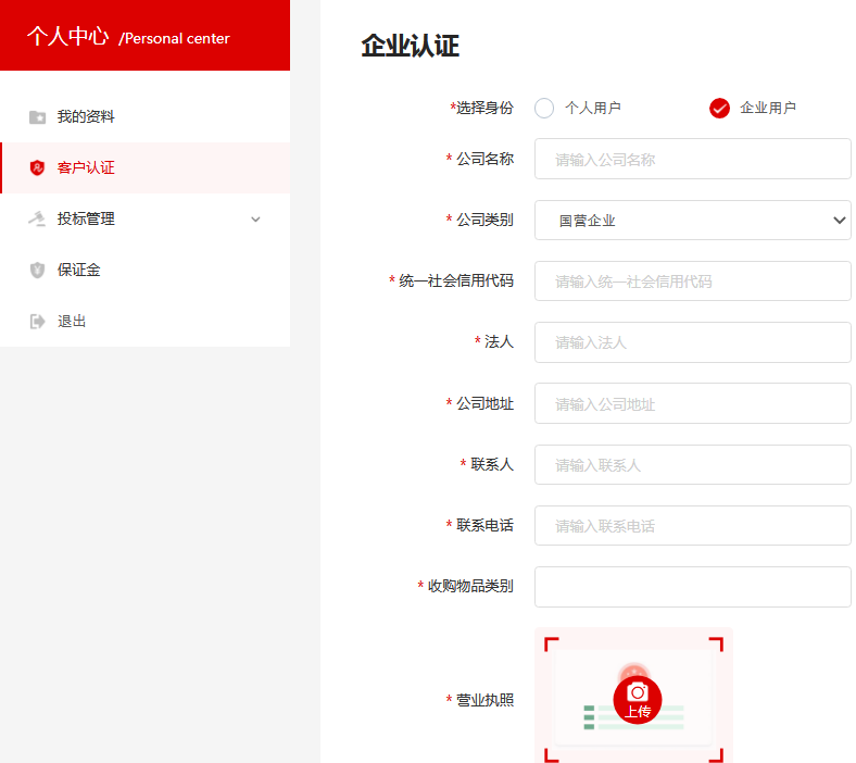 (2)認(rèn) 證:投標(biāo)方登錄后在個(gè)人中心完善詳細(xì)資料并提交認(rèn)證;